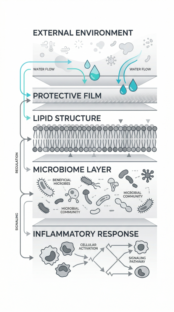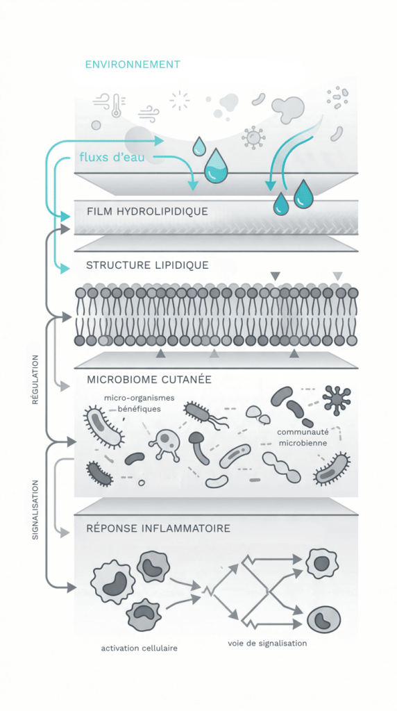 La peau s’organise selon une séquence précise : environnement, film hydrolipidique, barrière cutanée, microbiome, puis réponse inflammatoire.